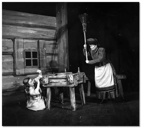 Nr 87 (286) ERN: “Vaeslapse käsikivi” (J. Kangilaski, 1953). Kuj. R. Laidre. Stseen lavastusest: (vasakult) Vaeslaps – I. Kasesalu, Võõrasema – H. Raa. /Foto: A. Alla/