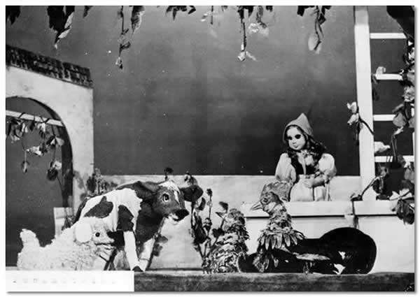 Nr 90 (286) ERN: “Punamütsike” (E. Toona, 1954). Kuj. R. Laidre, nukud H. Vilms (vasakult): Kutsikas (E. Aavik), Vasikas (A. Kivirähk), Kana (M. Varango), Kukk (J. Kepp), Punamütsike (I. Kivirähk).