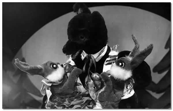 Nr 99 (286) ERN: “Võlukaloss” (G. Matvejev, 1957). Kuj. R. Laidre. Stseen lavastusest (2): Jänesed Hipp ja Hopp (M. Jürgo ja U. Leies), Karu (K. Renel). /Foto: A. Alla/