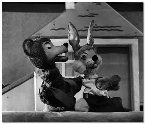Nr 104 (286) ERN: “Metsakell” (G. Stefanov, 1959). Kuj. R. Laidre. Stseen 2. vt: (nukud vasakult) Karu (V. Luup), Jänes (U. Leies). /Foto: A. Alla/