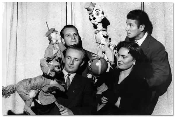 Nr 130 (286) Näitlejad nukkudega (1958): (vasakult 1. r) U. Leies, A. Kukepuu, (2. r) V. Luup, K. Renel. /Foto: V. Vahi/