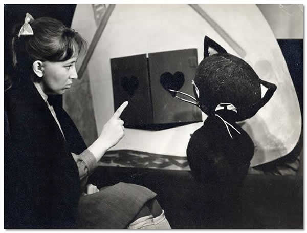 Nr 141 (286) ERN: “Pöial-Liisi ja pääsuke” (A. Bruštein, 1966). Kuj. R. Laidre. Stseen lavastusest: Tüdruk – M. Peedo, Kass (V. Luup).