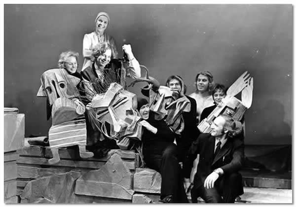 Nr 166 (286) ERN: “Kalevipoja võitlus sarvikuga” (J. Kangilaski, 1973). Kuj. K.-A. Püüman. Trupp (vasakult): M. Toompere, L. Lippur (Linda), R. Kotkas (Kalevipoeg), O. Liigand (Sarvik), P. Kuulpak, U. Ott (Kalevipoeg), H. Laas, lavastaja F. Veike.