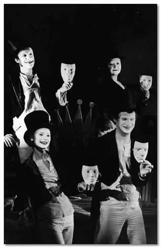 Nr 186 (286) ERN: “Gulliver ja Gulliver” (M. Unt, 1979). Kuj. J. Vaus. Näitlejad ja maskid: (ees vasakult) M. Toompere ja U. Alender, (taga vasakult) A. Uder ja M. Peedov. /Foto: M. Jõelaid/