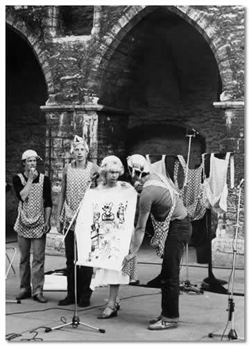 Nr 203 (286) ERN: “Hiir! Hiir! Hiir!” (grupitöö, 1982). Stseen lavastusest: (vasakult) H. Seljamaa, T. Raadik, A. Presjärv, H. Kõrvits. /Foto: K. Suur/