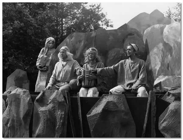 Nr 219 (286) ERN: “Kalevipoja lood” (A. Ehin, 1988). Kuj. R. Lauks. Stseen lavastusest: (vasakult) H. Toompere (Kalevipoeg), M. Tabor, M. Kampus. /Foto: M. Raude/