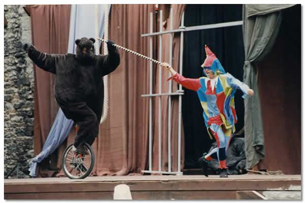 Nr 250 (286) ERN: “Saladuslik tsirkus” (H. Rand, 1997). Kuj. K. Kivi. Stseen lavastusest: Karu – E.-K. Sander, Narr – T. Gross.